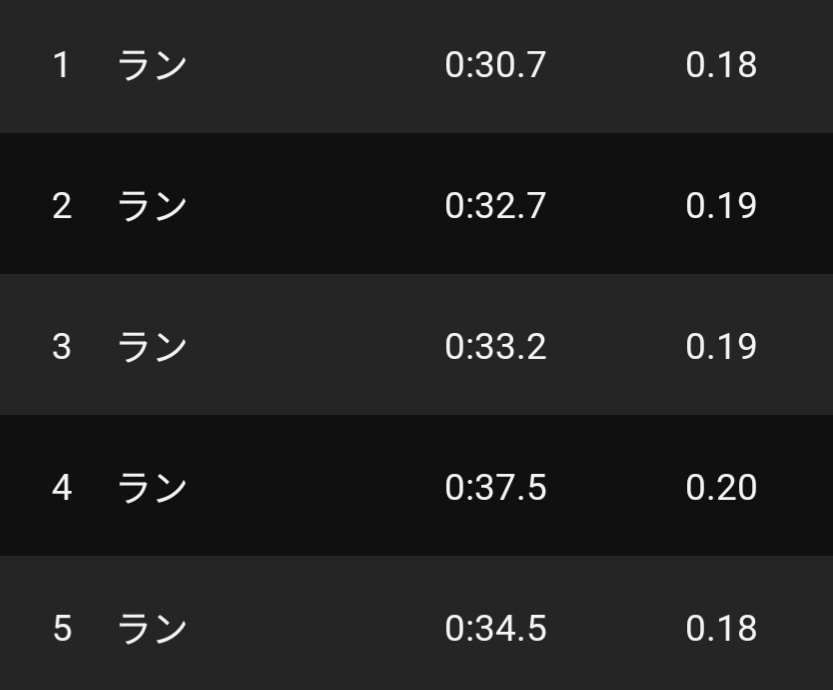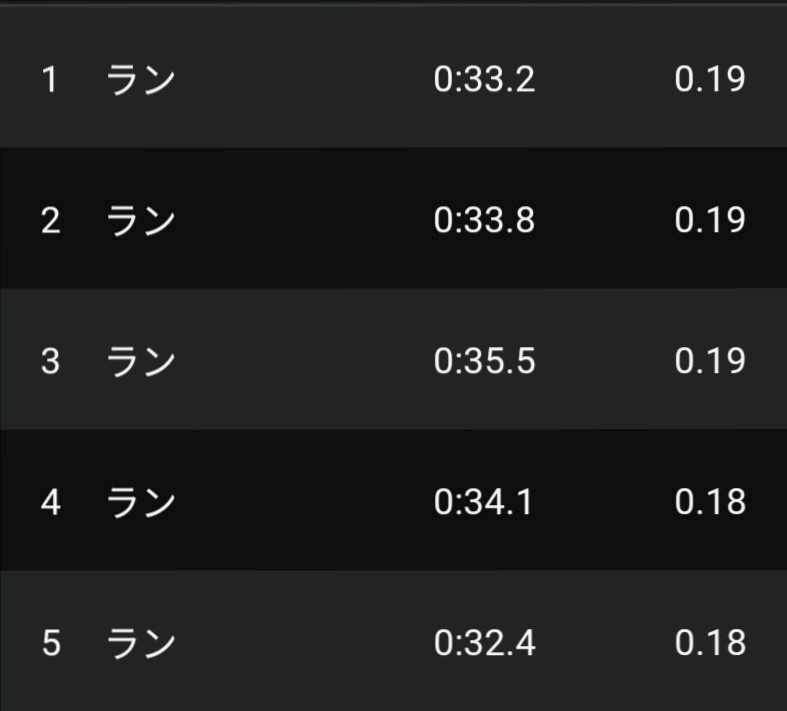 競技場200m×5×3 r50秒 R10分締めの400m 67秒今日は足が重め。先日の5kmの影響か、単純に前回より休みが少ないからか。35秒を超えたのは良くないが、人が多くて走りにくかったのは仕方ない。終わったあとの足の疲れがすごいので、負荷は良かった気がする。セットの最後でスピードを上げる意識で腕振れたのは良かった。スピード練も必要な気がしてて、インターバルも最初は全力にして、その後体力で繋ぐイメージでもよいかも。ジムダンベルRDL 36kg×13×3 レッグプレス 100kg×13×3アブダクション 40kg×13×4チェストプレス40kg×6×4ダンベルカーフレイズ 40kg 13×3背筋 50×2腹筋 50×2