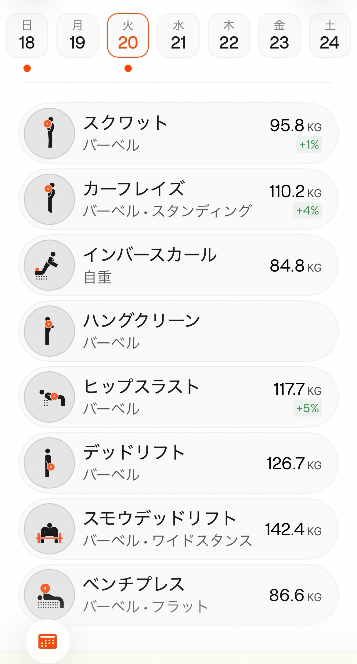 クリーン60×370×275×3 ×3セット ベンチ60×580×585×4フロントスクワット80×385×2フルボトムスクワット80×595×5105×2レッグカール 15×10 2セット懸垂 10×2腹筋 20×2〜3ランジ40 左右5回ずつ45 左右8回ずつ×2セット