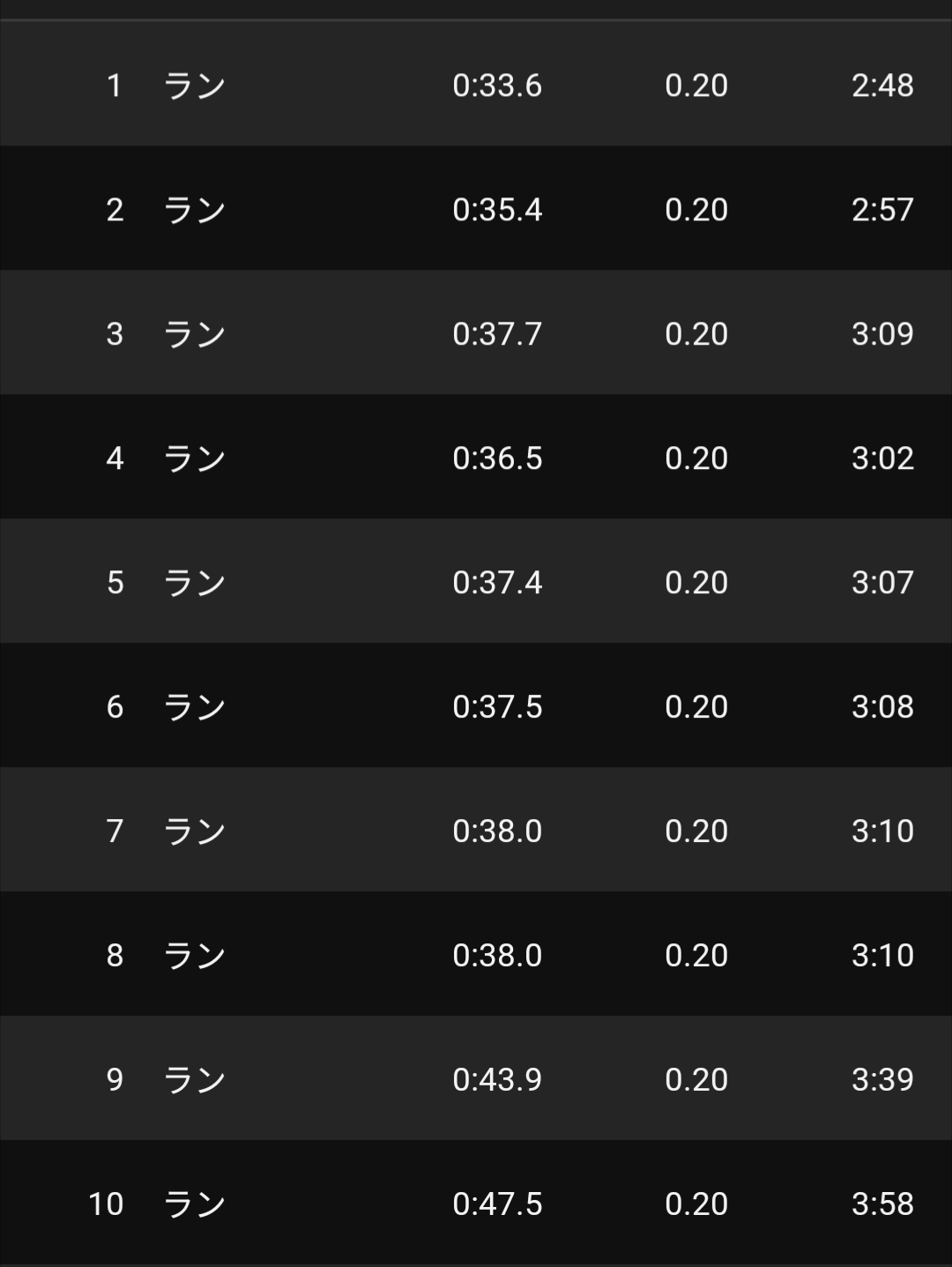 設定タイム38秒でやってみました。以前は40秒だったので上がってますが最後2本で急に力がはいらなくなってしまいました。糖質不足がな、、、